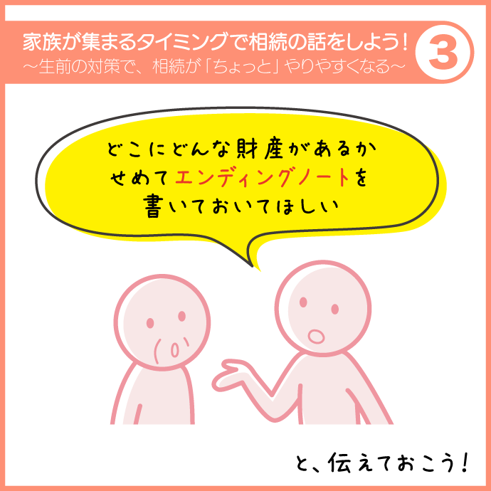 せめて「エンディングノート」や「財産一覧のメモ」などを用意し、「必要な手続き」が一目でわかるようにしておいてもらうとよいでしょう。