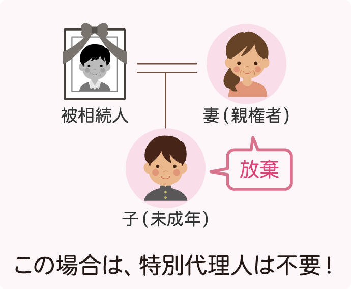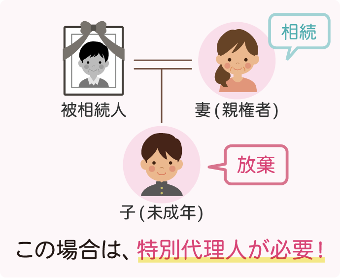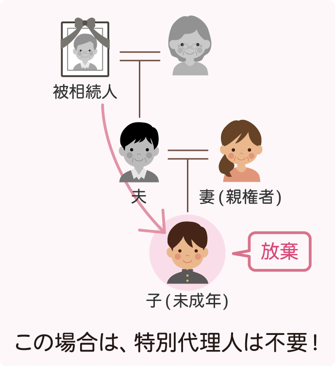 状況によっては、父母では相続放棄の代理をすることができず、家庭裁判所に申し立てて「特別代理人」を選任してもらう必要があるためです。